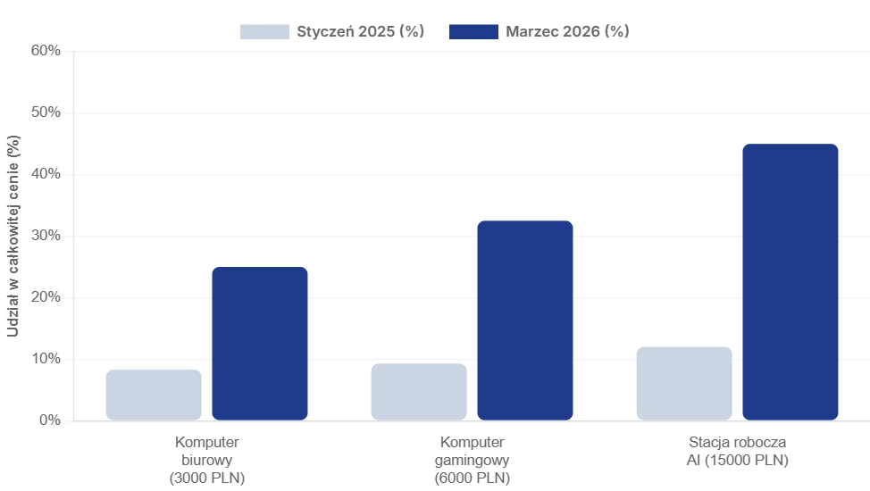 Wskutek rosnących cen RAM-u naturalną koleją rzeczy drożeją nowe laptopy i komputery. Zależność tę doskonale przedstawia wykres obrazujący, jaką część ceny komputera stanowi obecnie koszt modułu pamięci RAM.