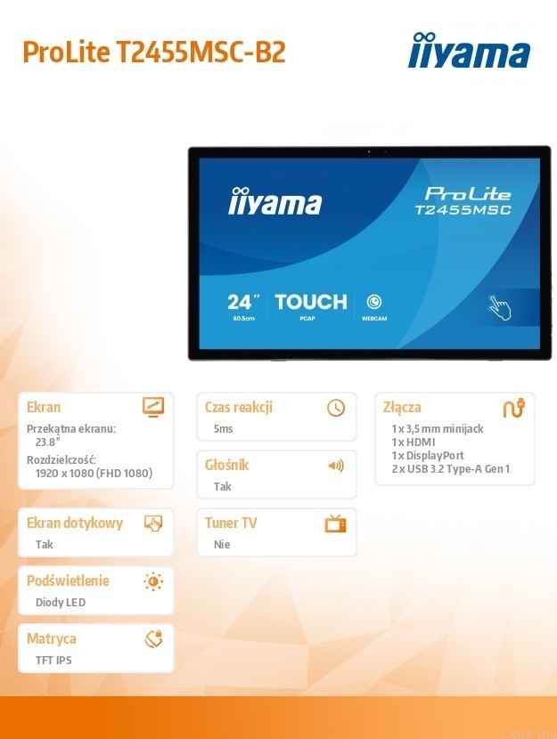 Produkt: IIYAMA Monitor 24 cale T2455MSC-B2 POJ.10PKT.IPS,HDMI,DP,USB3.0,CAM,MIC, FHD 120Hz